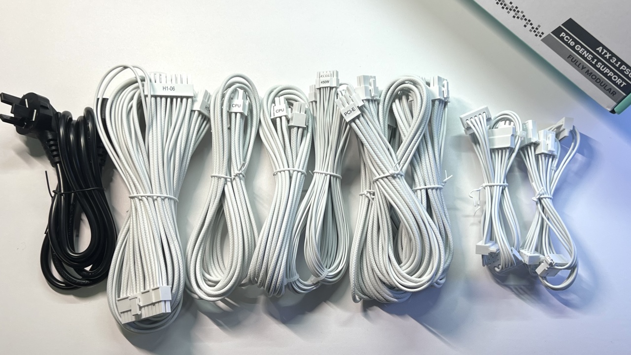 模组线材这块:次序是电源线、主板20+4pin线、2×CPU 4+4pin线、显卡16pin PCIe 5.1线、3×显卡6+2pin线、6pin SATA线、6pin大4D线。SATA线只给了一根,装多块机械盘的玩家可能有点不够用。