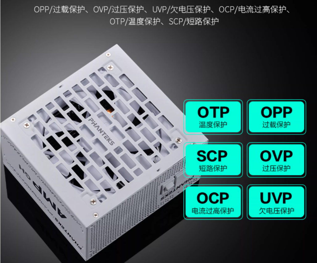 追风者的AMP GH系列通过多项海外认证如CCC、TUV、RoHS等,并适应EAC、CE等高要领条目,相沿100-240V宽幅电压,在全球不同地区的电网环境中皆能结识运行。主动式安全这块,过流保护(OCP)、过压保护(OVP)、短路保护(SCP)、过载保护(OPP)、欠压保护(UVP)和温度保护(OTP)皆有,确保了高负载下电源的性能和结识性。