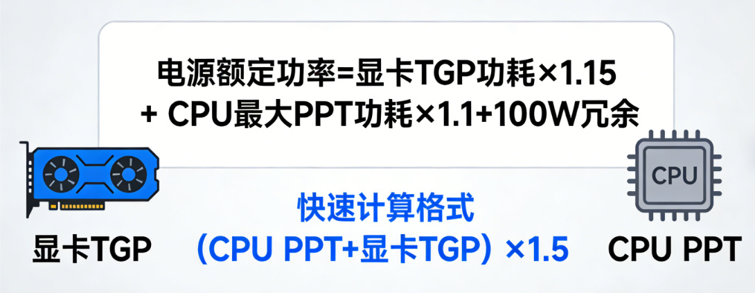 要选定的电源额定功率应该等于显卡TGP功耗×1.15 + CPU最大PPT功耗×1.1+100W冗余。