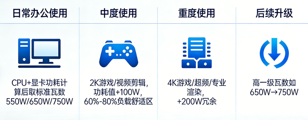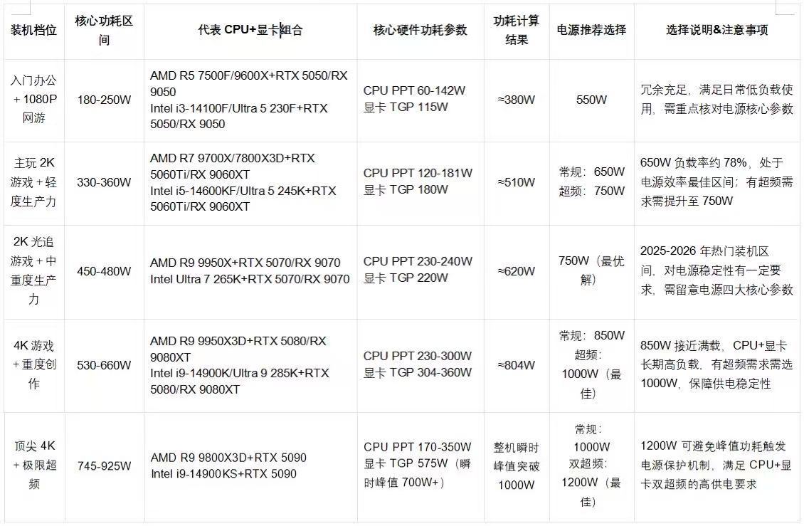 预算有限、不考虑后期升级竖立的情况下选电源的中枢是“匹配功耗+预留冗余”。电源功率买高了,低负载下高功率电源诊治效率低,费电还影响电源寿命;电源功率买低了,则会出现供电不稳、蓝屏、以致损坏显卡和CPU的情况。