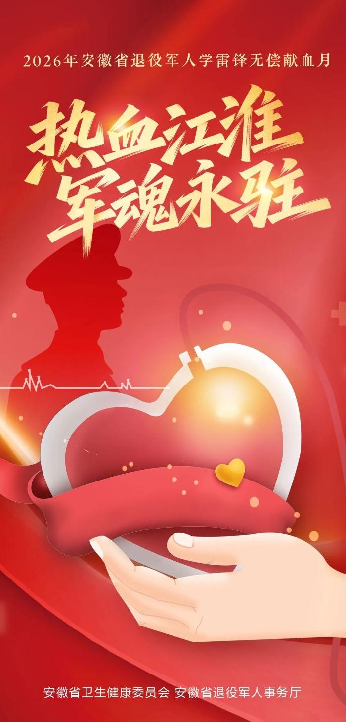 大皖新闻讯 为阐发雷锋精神,激发全省退役军东说念主奉献爱心,有用保险临床用血需求,近日,安徽省卫健委与安徽省退役军东说念主事务厅筹商印发《对于组织开展2026年安徽省退役军东说念主学雷锋无偿献血月当作的示知》(以下简称《示知》),于3月在全省界限内开展以“热血江淮 军魂永驻”为主题的无偿献血月当作。
