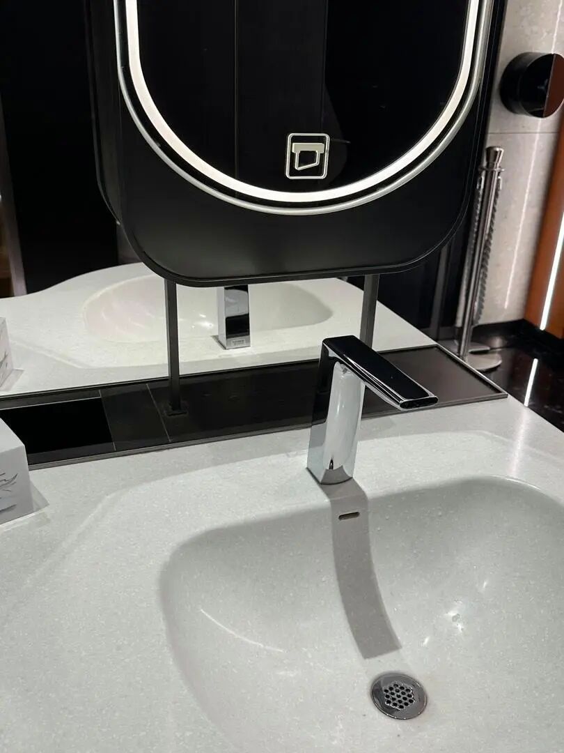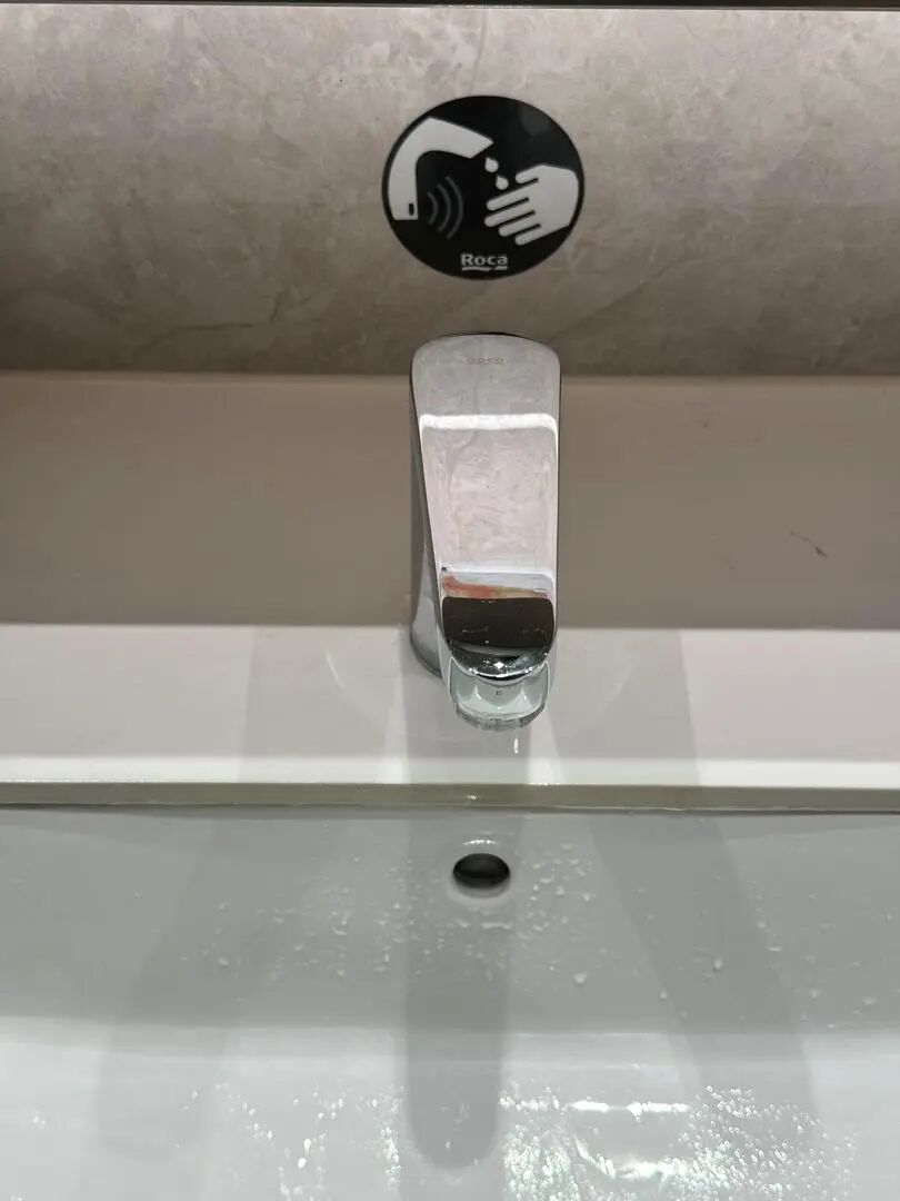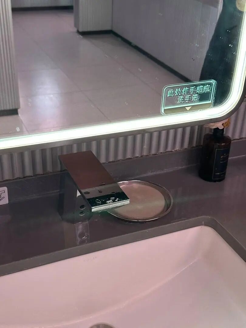 这里感应水龙头的开拓也不太合理:感应区不在出水口处,而是在水龙头阀体下方的“两个点”位置,且阀体合座上前歪斜,位置靠里,这皆未便于触发感应。有主顾高下往返反复尝试后皆莫得出水,经保洁员提醒,才找到感应区。“经常有主顾找不到,有东说念主就对着水龙头拍拍打打,还误以为是没水呢,咱们总得提醒。”一位保洁东说念主员说。
